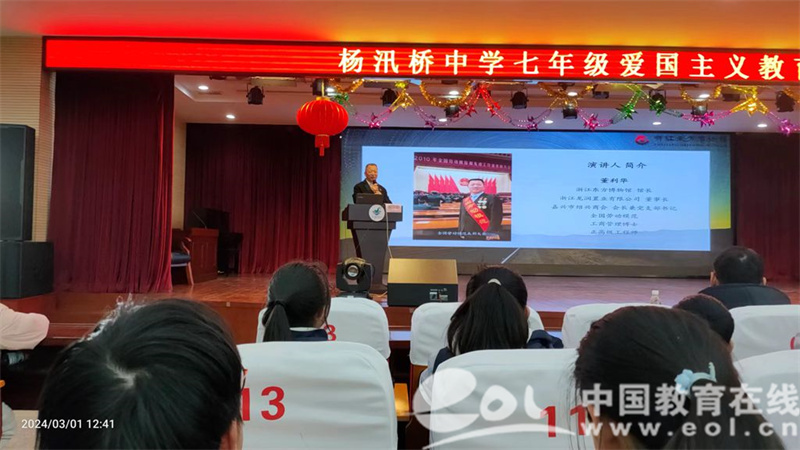 中国教育在线浙江站讯 (编辑 鲁少辛 通讯员 鲍文贤)近日,浙江省绍兴市柯桥区杨汛桥中学江桥校区举办了以“百年荣光耀东方”为主题的爱国主义教育专题讲座活动。