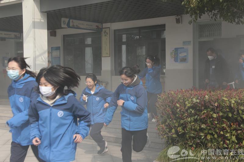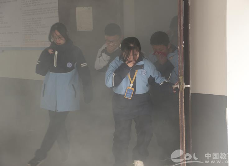 警报声突然响起,同学们用手帕捂住口鼻,迅速有序地整好队伍撤离教室。在楼梯间,同学们也能做到不推搡不拥挤,跟紧班级队伍,尽然有序地撤离教学楼。在不到3分钟的时间里,全体师生全部撤离“火灾”现场。