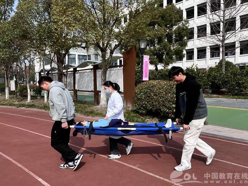 楼道中有不慎“受伤”的同学,教师们和医护人员及时进行救助,将“受伤”同学安置到安全的位置,并由医护人员进行进一步检查。