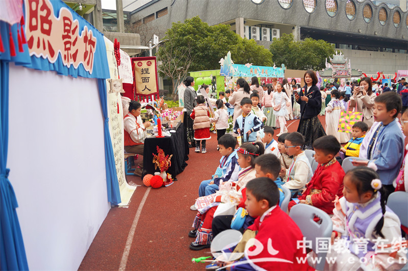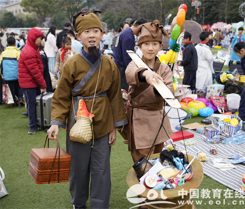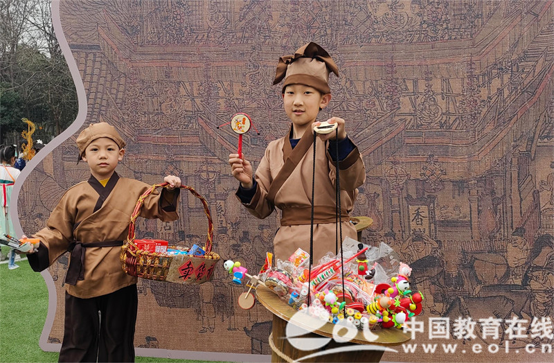 “说书先生”、“货郎”、“轿夫”、“船夫”......这些画中人从画卷中走来,跃入了胜利实验的校园。说书先生摇头晃脑、口若悬河,讲得小海燕们痴迷不已。货郎挑着担子行走于铺面间,大声吆喝吸引着小海燕们光顾。