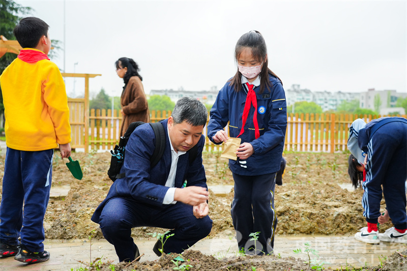 活动中,同学们还前往迭代升级后的“半亩地”生态教室(由茶园和菜园组成),带领下认领责任田,在专家、老师的指导下,播种黄瓜、辣椒、黄秋葵、玉米、番茄等农作物。其中,最特别的是五年级六个班同学种下的六种不同颜色的玉米种子,白玉米、黑玉米、红玉米、彩色玉米、灰黑玉米、紫玉米,这些都不是常见的种类,因此同学们感到非常惊奇。