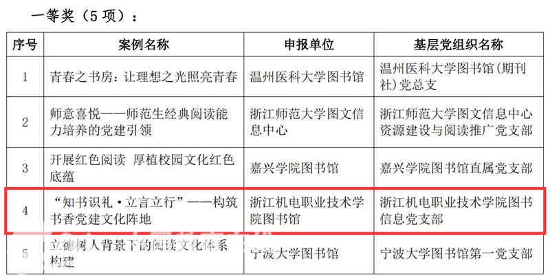 中国教育在线浙江站讯 (记者 陈显婷 通讯员 庄婷婷)近日,浙江省高等学校图书情报工作委员会公布了2023年浙江省高校图书馆基层党建创新典型案例的评比结果,浙江机电职业技术学院报送的“‘知书识礼·立言立行’——构筑书香党建文化阵地”案例脱颖而出,荣获一等奖,成为唯一一所获此殊荣的高职院校。