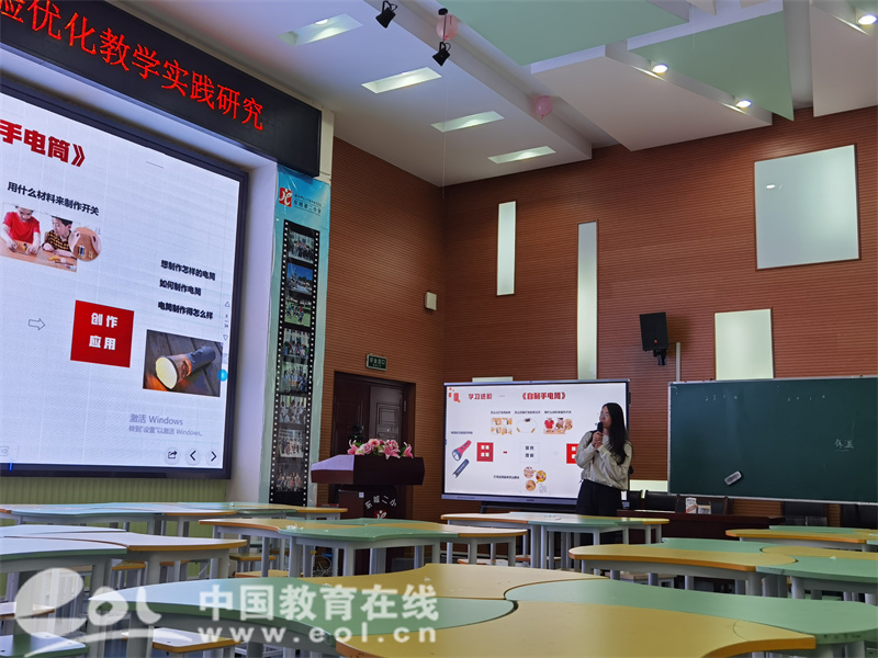 杭州市澎致小学的陈晶晶老师汇报《科学素养导向的实验优化案例分享》,围绕《自制手电筒》项目,让学生在学习知识的过程中,不断推进项目进程,在应用知识解决问题过程中促进对概念的理解。陈老师注重学生的交流展示分享,让学生从结构和材料、内部电路设计等维度深入研讨,最后通过拆装手电筒,让学生在比较观察中进行更新迭代。