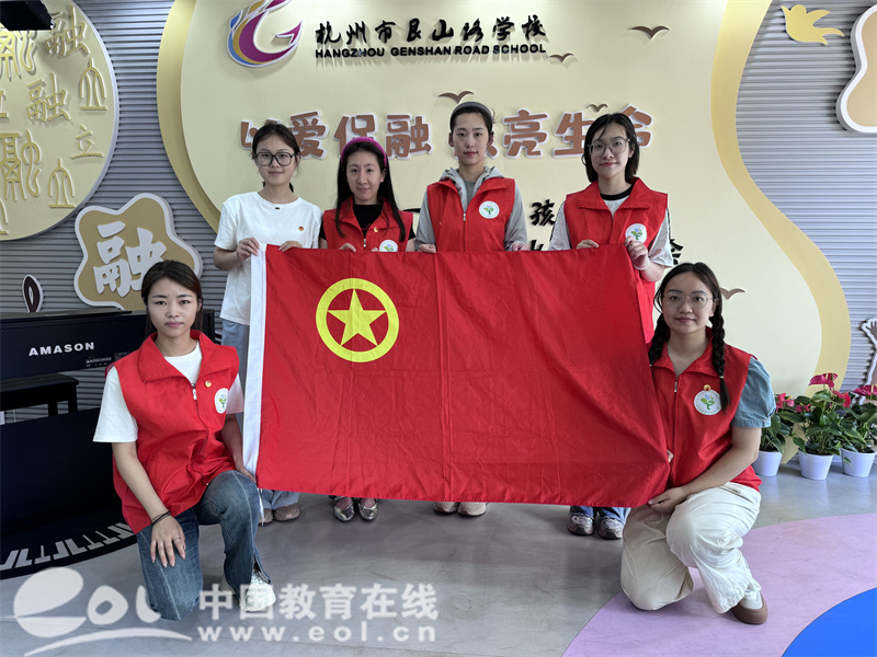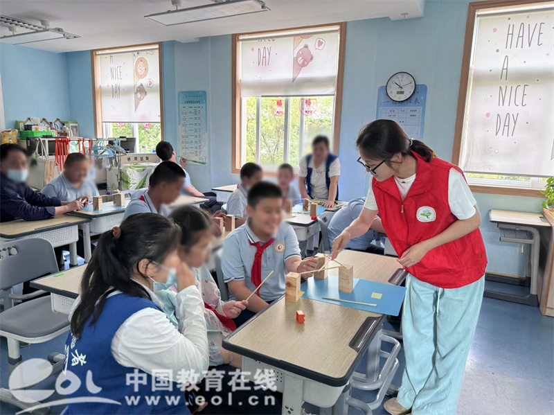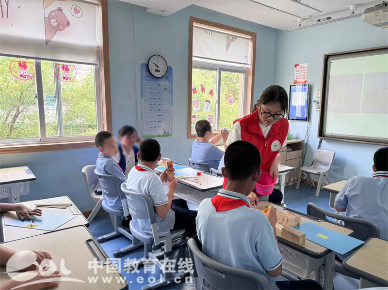 中国教育在线浙江站讯 (编辑 陈显婷)“清浅夏初至,迎风送课来”。近日,为促进普特融合教育均衡发展,关爱特殊学校星星儿童们,杭州市笕桥花园幼儿园的团员教师走进艮山路学校开展“悦城青年送温暖,微光连绵印心间”送教暨迎“六一”活动。团员教师们充分发挥各自的专业特长,为艮山路学校的孩子们带来了一系列丰富多彩的教学互动。