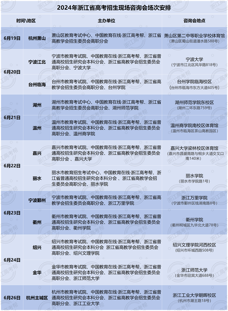 为了帮助广大浙江考生科学填报,圆梦大学,在浙江省普通高校招生研究会本科分会、浙江省高教学会招生委员会高职分会指导下,根据2024年浙江省高考进程,中国教育在线·浙江高考帮将联合杭州、宁波、温州、嘉兴、湖州、绍兴、金华、衢州、台州、丽水、萧山等地市教育考试部门,举办“2024年浙江省高考招生现场咨询会”(以下简称“咨询会”)。
