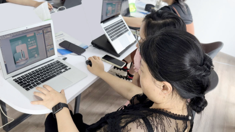 有了“618”携手实战经验后,7位教师结合企业导师分享的多年运营积累的爆款打造“武功秘籍”。老师们分成美工组、短视频组、活动促销组,通过数据分析工具深入了解了当前市场的热点商品、价格趋势及竞争状况进行选品,结合市场分析和消费者需求,最终精选出具有潜力的婴儿吸发器进行推广,也深知在真实运营中,产品主图在商品引流中如此重要,在制作中不能只看“颜值”,更多地从搜索结果中与其他竞品去对比,从背景、产品、文案设计中脱颖而出。