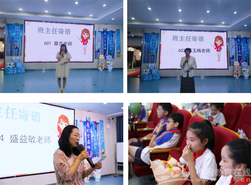通过一段段视频、一张张照片,全体师生重温了六年小学生活的点点滴滴。那个总会为我们系上松掉的鞋带,挽起我们散落的头发,是朋友亦是老师的班主任,最后一次为同学们送上了真诚的祝福。