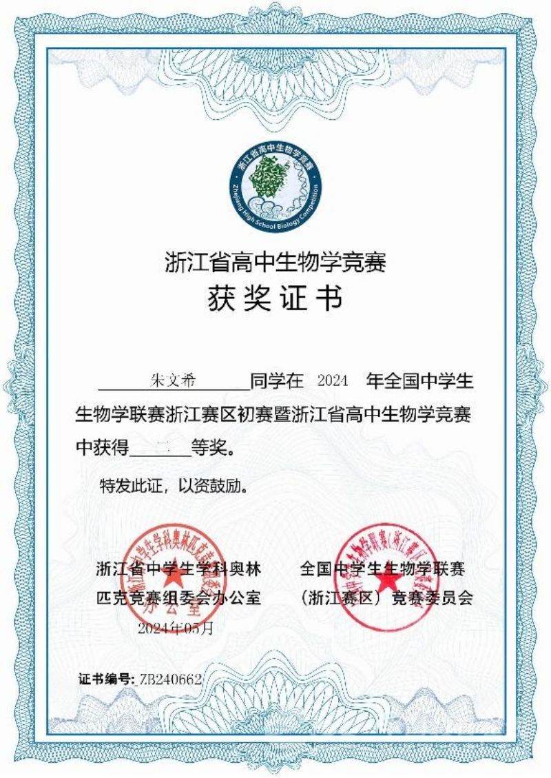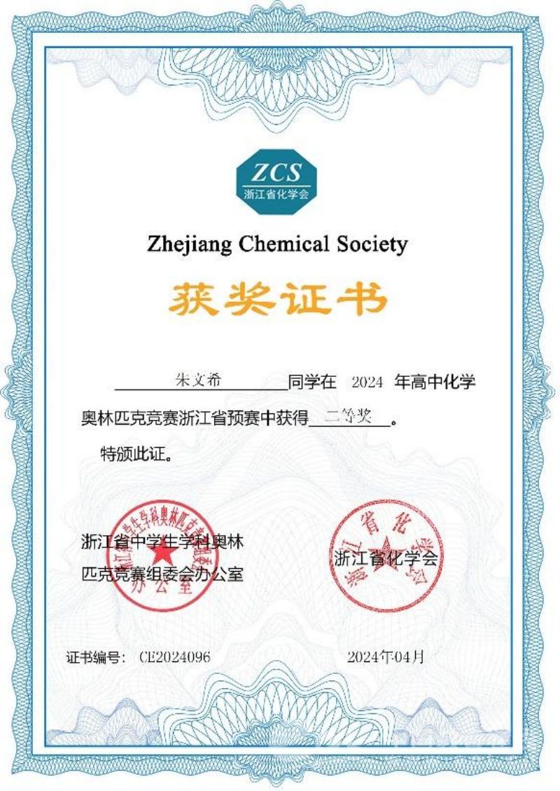 同时,他积极参加学校数学、化学和生物三门学科竞赛,并且在化学竞赛和生物竞赛中均有斩获。
