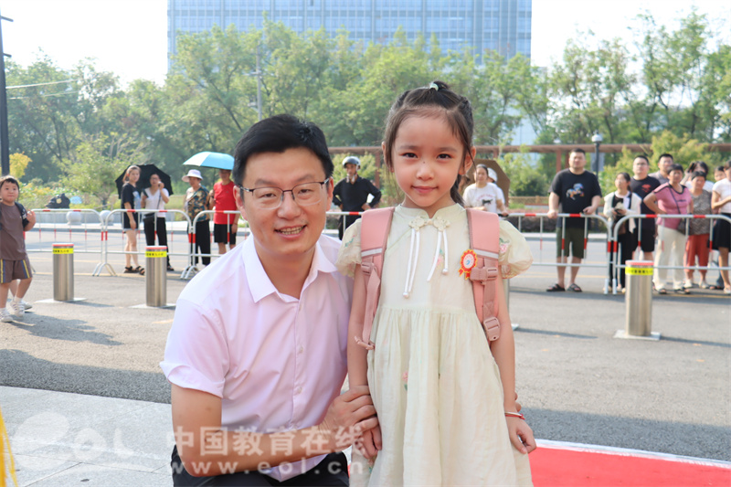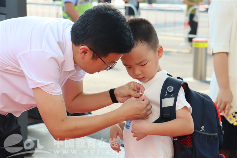 校门口,一条鲜艳的红地毯一路展开,孟校长带领学校其他领导、老师热情地为一年级的小萌娃们佩戴上写有“求是阳光学子”的小红花胸章,以满满的仪式感欢迎这些孩子们加入温暖的求是富春九小大家庭。一旁的铁网架上,五彩缤纷的小夹子夹着的是学校为同学们精心定制的奥运主题种子卡,这些种子蕴藏着大大的惊喜,静静等待着同学们播种,开启一段充满希望的成长新旅程。
