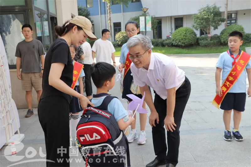孩子们迈着轻快的步伐来到了学校,手中的自制纸风车,五颜六色,形状各异。校门口,四位校长身着整齐的正装,笑容满面地欢迎新同学,还精心准备了礼物,作为开学礼。