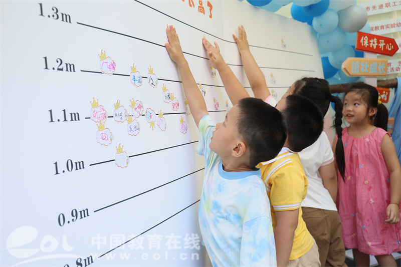为了增添开学的特别记忆,老师们还策划了“摸一摸,长高了”的活动。大班孩子郑重地在标签纸上写下名字贴在身高板上,中班的孩子则将画上笑脸贴到在对应的位置,小托班的宝贝用印章敲一个笑脸。孩子们踮起脚尖,拼命地伸长手臂,有的还跳了起来,在欢声笑语中,迅速找回了熟悉的感觉。投过幸运球门,贴上成长贴纸,每个孩子还获得了一个专属定制的成长勋章,这是孩子们的第一份开学礼,也是成长的见证。