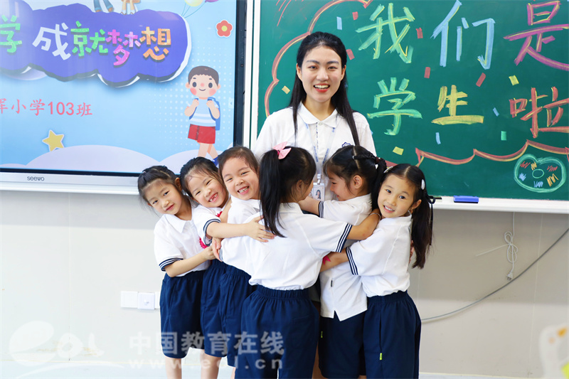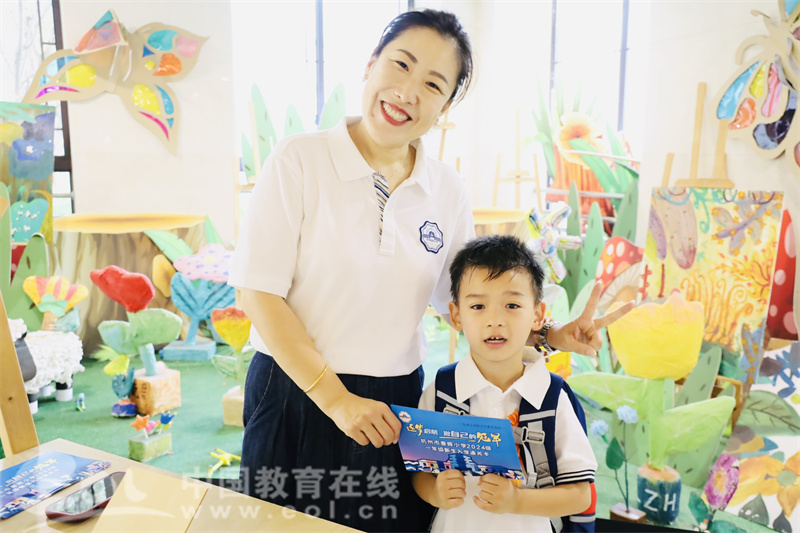 伴随着轻快的旋律,班主任老师给孩子们递上专属姓名牌与温馨寄语,还有一张打开快乐王国的“通关卡”。