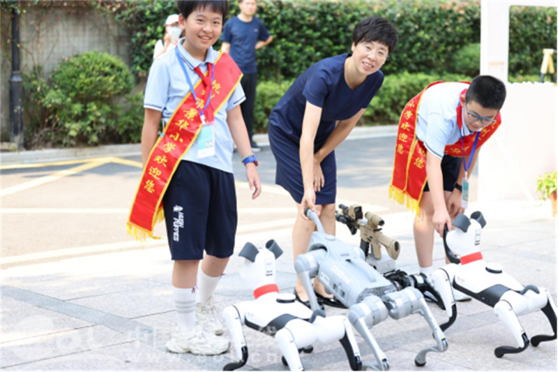 中国教育在线浙江站讯 (编辑 陈显婷)开学日,景华小学的校门口不仅有大家熟悉的校长迎接,还多了一群狗狗护卫队的守护。它们有时跟在同学们身旁,想要一起去上学,有时伸出小手,表示友好;偶尔还会翻个跟头,显示本领。这支狗狗护卫队给开学增添了无限的乐趣。