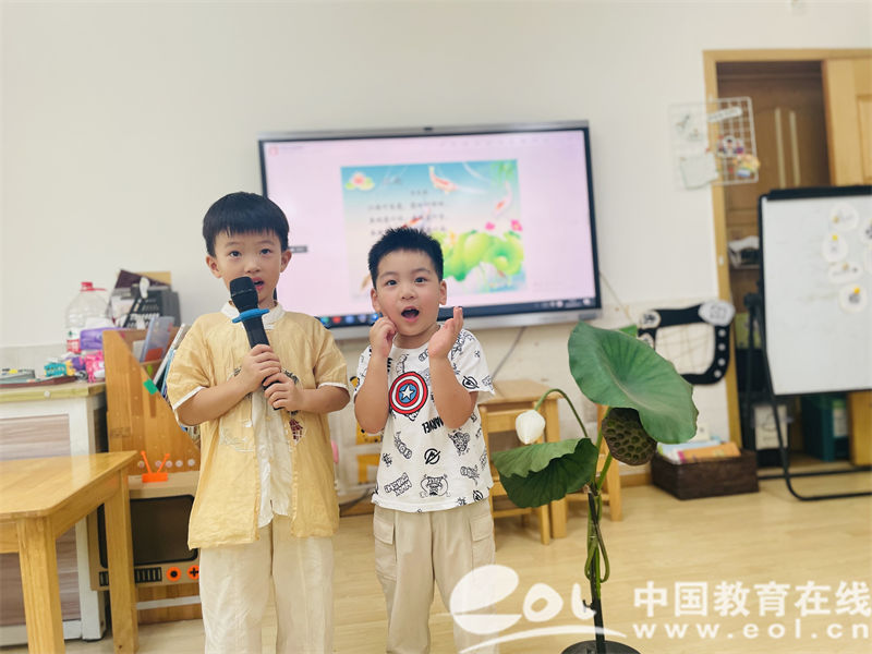 为了让孩子们感受中华诗词的韵律之美,传承中华文化精髓。教师们精心挑选了适合幼儿年龄特点的唐诗,通过生动的讲解和领读,引导孩子们感受古诗词的韵律之美和意境之深远。瞧,老师还设置了“小小展示台”,请小朋友孩子上台展示,孩子们大声地向小朋友们他们自信满满、声情并茂的表演赢得了阵阵掌声,让在场的每一个人都感受到了中华文化的博大精深。
