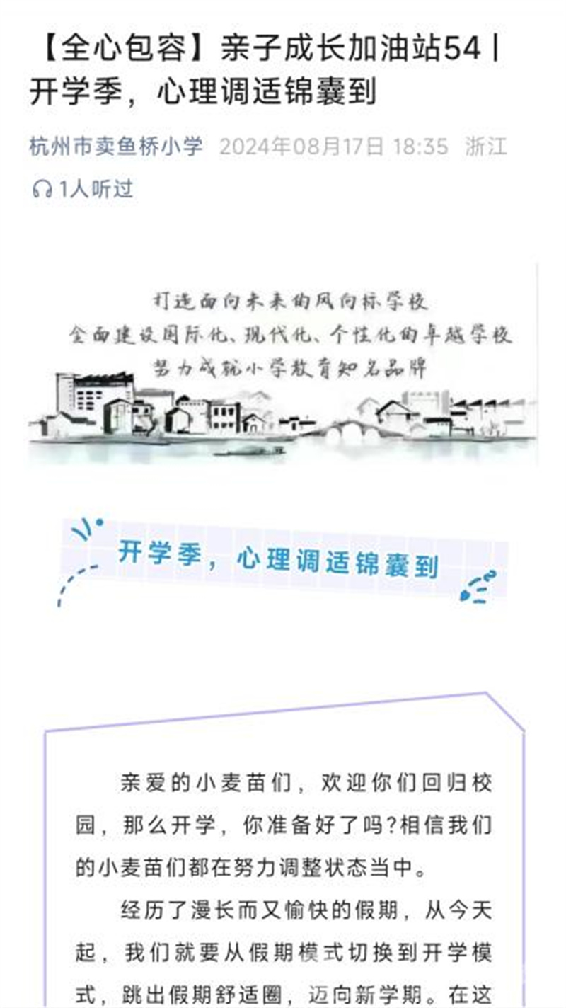 中国教育在线浙江站讯 (编辑 鲁少辛 通讯员 范扬)新学期已开启,为了守护小麦苗们身心健康的成长,杭州市卖鱼桥小学全纳教育中心继续深入探索健全“家校社医”四位一体育人模式,共同搭建协同育人的有效运行机制和资源网络平台,帮助每一个学生健康成长,成就每一个学生的更多可能。