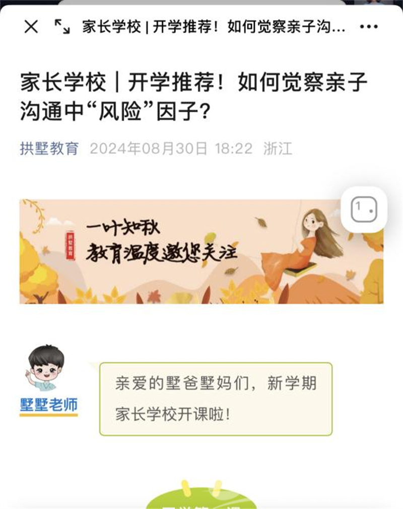 同时,推荐家长收看拱墅教育推荐的家长学校课程《如何察觉亲子沟通中的“风险因子”》,指导家长学习亲子沟通的技巧,为孩子创造充满爱的成长环境。