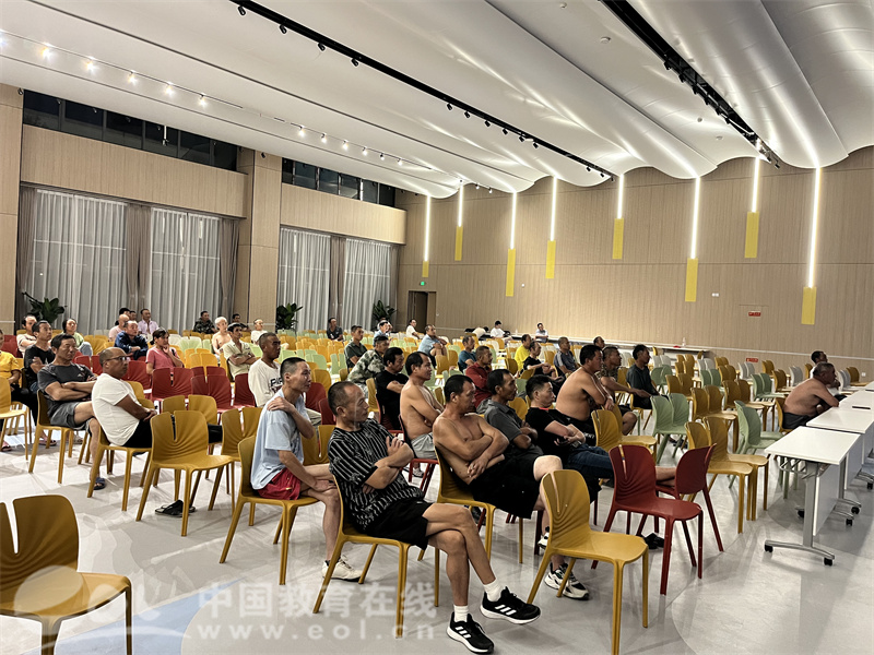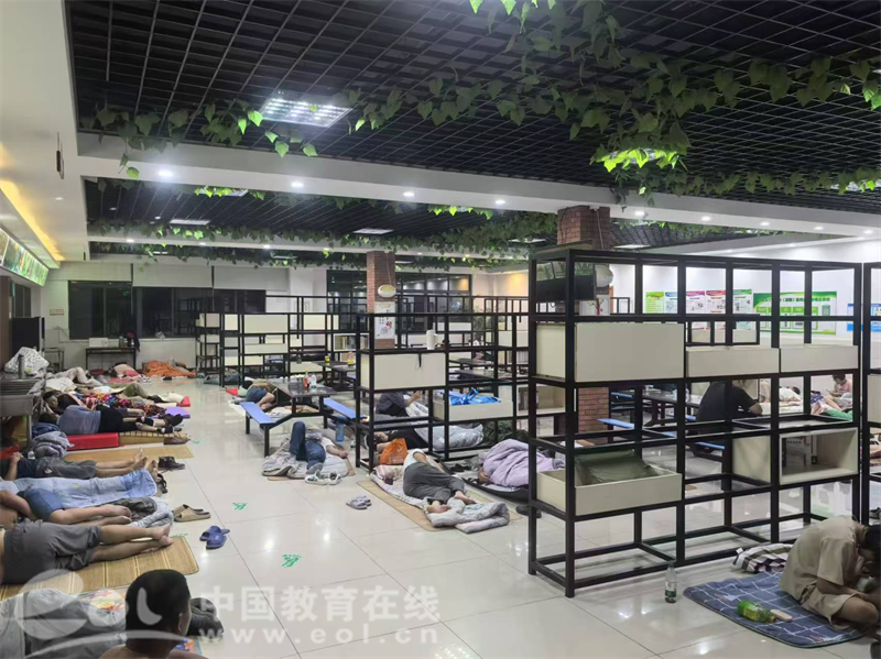 学校的工作人员热情接待,引导他们找到合适的休息区域,并提供方便面等物资,还在报告厅放映电影,确保每一位工友都能得到妥善的安置和照顾。