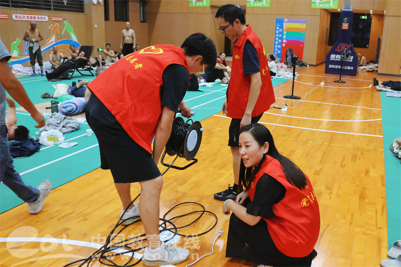 学校党员干部冲锋在前,区城投集团、区教育局、区住建局、白杨街道、银海社区、白杨社区医院、派出所等单位,均派专人驻点服务,为避灾群众提供食物和物资,设立“红色安全课堂”防台防诈骗;为妇女开辟专门休息区,安抚情绪;播放红色主题电影,丰富精神文化生活,提升群众共同防台抗台、共渡难关的信心。