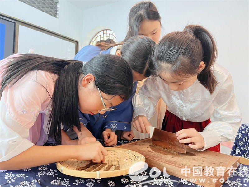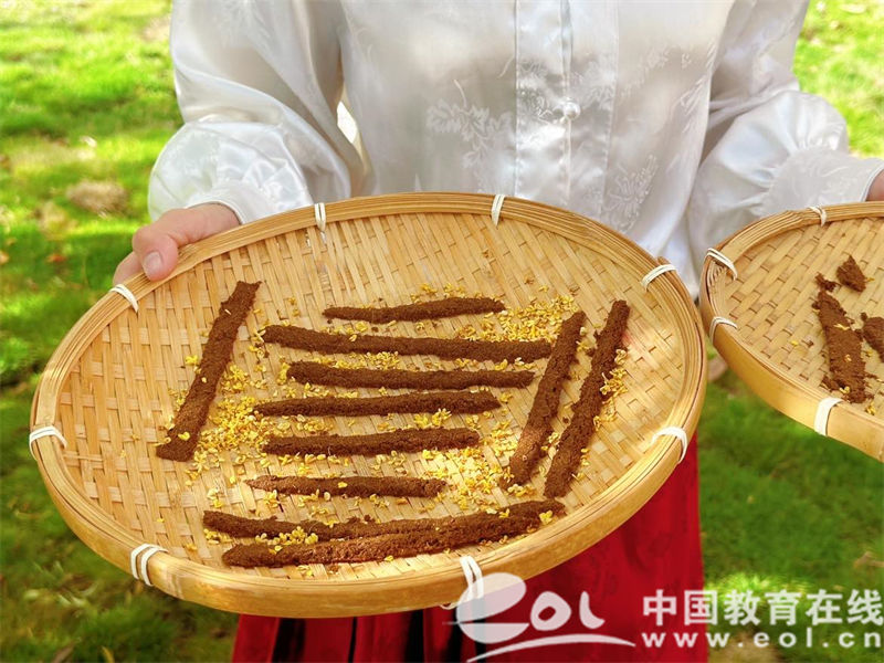 在老师的指导下,学生们分成几个小组,按组领取了所需的材料和工具。大家纷纷动手操作,有的负责捣碎干桂花,有的负责和面团,还有的负责切条。整个过程中,学生们相互协作,气氛热烈而有序。