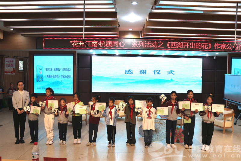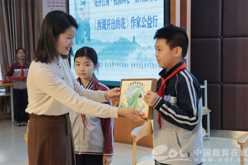 儿童文学作家马丽飞老师为学生代表赠送了新书和“西湖开出的花”专属“开花”版画,祝福“西湖之花”在青蓝青华的校园开得更灿烂、更久远。