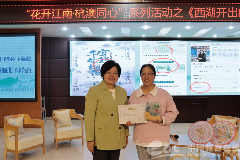 中国教育在线浙江站讯 (编辑 占尘雪 通讯员 陈茜茜)10月30日下午,杭州市青蓝青华实验小学迎来了一场精彩的文化活动——“花开江南·杭澳同心”系列活动之《西湖开出的花》作家公益行。此次活动荣幸邀请到了浙江教育出版集团学术出版分社副社长冯傲雪老师、儿童文学作家马丽飞老师,以及《西湖开出的花》责任编辑李剑老师。同时,学校吕晓丽校长和包奕颖校长也亲临现场,共同见证了这一活动。