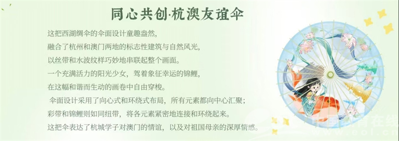 “我和爸爸妈妈刚刚去过澳门,去了大三巴。看到大三巴和三潭印月融合在了伞面上,让我感到特别亲切。我还想再创作一把‘杭澳友谊伞’!”