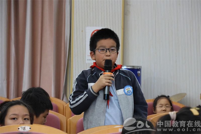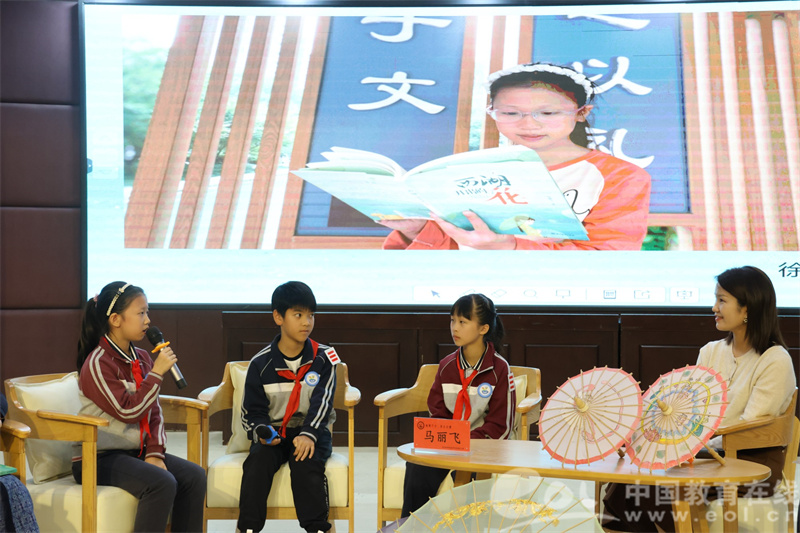 在圆桌分享环节中,马老师特别邀请了喜爱这本书的学生代表们上台,面对面交流阅读感受。五年级学生代表徐李杭、陈菓、项卓然、王宇辰与马老师进行了深入的对话交流。