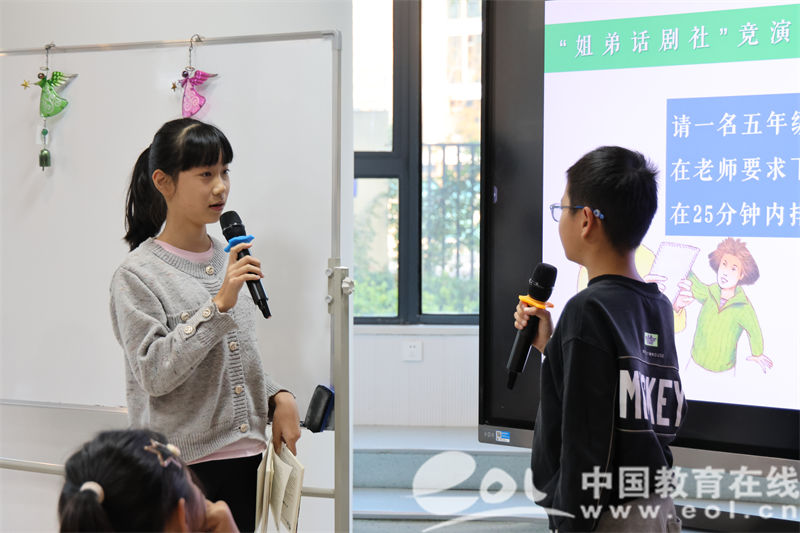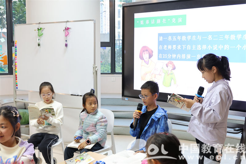 活动的高潮部分,五年级的孩子们与二、三年级的孩子们自由组合,自主选择小说中的片段,通过角色扮演的形式,将一场场精彩的课本剧呈现在大家面前。