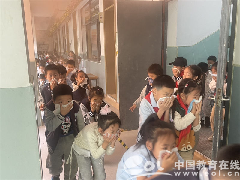 随即一阵警报声响起,随着学校广播“学校电井失火,请各位同学立即有序撤离”的模拟警报,全校师生进行了火灾逃生演练。同学们用湿毛巾捂住口鼻弯下腰,立刻按照原定疏散路线撤离。最快的班级18秒就全员到达操场,4分13秒时,全部的班级都撤离到安全地点。清点人数过后,安全员孙老师高兴地说“全校师生均已撤离到安全地区。”
