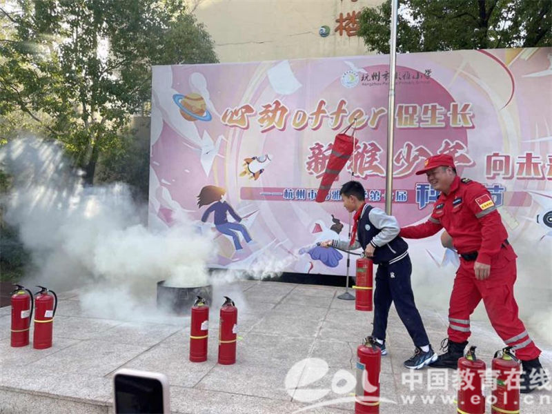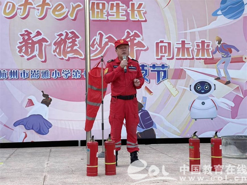 本次学校消防演练活动邀请到了上城区民安救援中心和杭州微型消防救援站的消防员叔叔们和全体师生、职工一起参与学习。同学们在教室学习安全微讲座,低段年级围绕什么是可燃物品、什么是灭火器、怎样疏散更安全等内容进行学习,高段年级围绕灭火原理、高处起火如何撤离等内容进行学习。