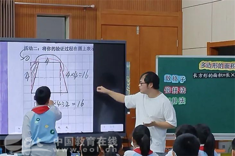 大禹路小学袁飚老师执教的五上《梯形的面积》引导学生从梯形面积公式的探究,推导到平行四边形和三角形面积公式的探究,使学生学会知识的迁移。