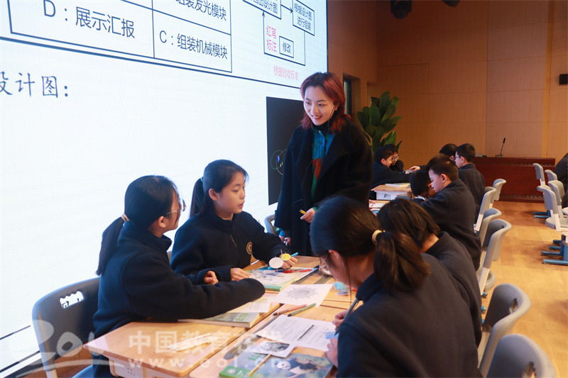 科学组青年教师杨倩倩与七年级同学共同带来《像工程师一样实践》课堂教学展示。杨老师用“超级月亮”话题吸引学生探究月食的成因,明确制作“三球运动模型”的科学依据。学生通过模块拆解三球运动模型,以地月系为例搭建双球系统运动模型并分析该模型的关键结构。最后,教师引导学生基于设计要求和验收标准完成三球运动模型的设计及构建,对方案进行模拟预测、迭代改进。本堂课既启发和规范了实践的过程,又促进了学生在实践中更加深刻地理解和应用工程实践的本质过程,营造出浓厚的科学学科实践的氛围。