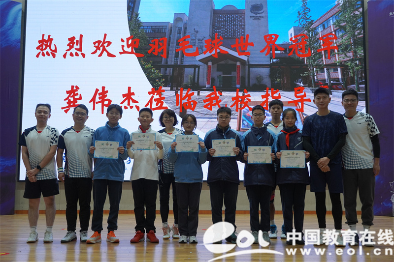 本次师生羽毛球赛,学校特别邀请了前世界羽毛球冠军、前中国国家羽毛球队队员龚伟杰作为嘉宾为同学们助阵。龚指导现场与师生们比赛交流,切磋球技,他在赛场上展现出的冠军风度和精湛技术让观赛的师生们爆发出阵阵掌声。在比赛的最后,龚指导为学校羽毛球联赛的优胜者颁奖,鼓励他们继续努力,让羽毛球运动成为助力健康成长的阶梯,将清河的羽毛球特色发扬光大。