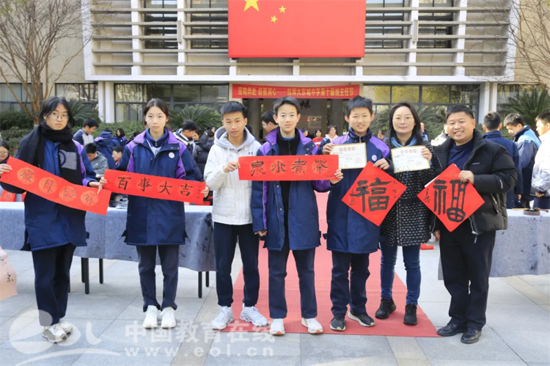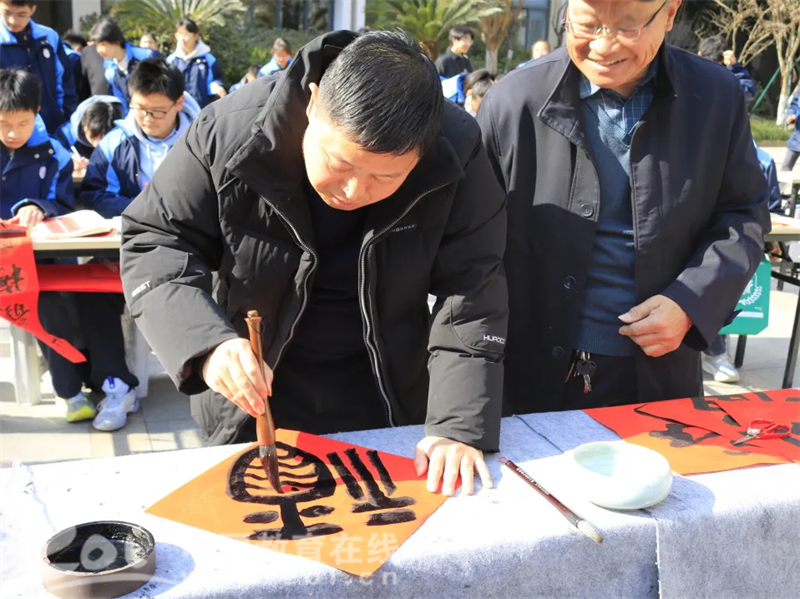 各班同学神情专注,笔走龙蛇,在一张张红纸上挥毫泼墨,将新年的美好祝愿化作一张张寓意吉祥的春联。一幅幅工整隽秀、飘着墨香的春联和一个个喜庆的“福”字跃然纸上,摆满整个校园,一派欢乐祥和的气氛。