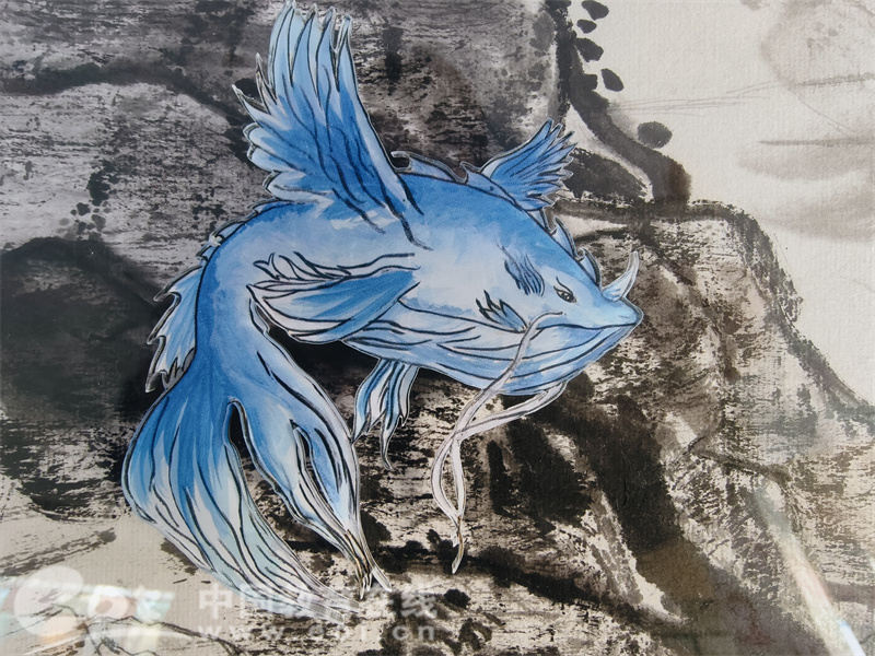 若馨画社的同学们在萌生创作的想法后,立即自主策划、精心筹划,分组合作,开始了这项充满挑战与创新的创作。他们首先用国画绘制出雄浑壮丽的背景,通过细腻的笔触和丰富的色彩,将《山海经》中那神秘莫测的场景呈现在画布上。