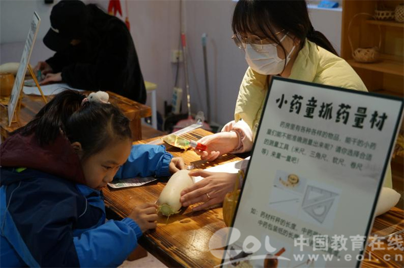 在“小药童抓药量材”环节,孩子们先认真聆听老师讲解要求,再手持自己选择的测量尺具,将数学学习的测量技能运用到了生活中。