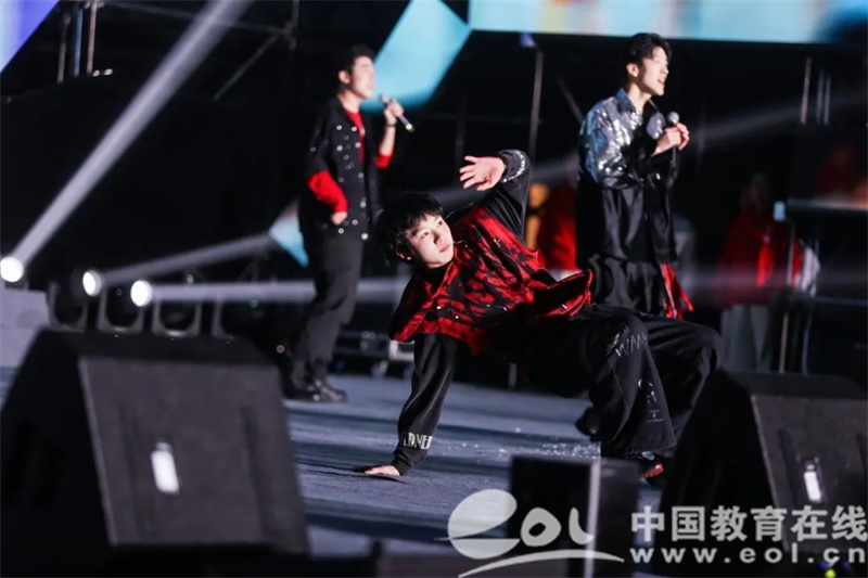 进入“致祖国”篇章,海创拉丁舞团的《High School Musical》、紫金港街舞团的《Let’ s go》以热情的舞步展现青春风采。全体学军人共同合唱《我爱你,中国》,将文艺会氛围推向高潮,表达了深厚的爱国之情。