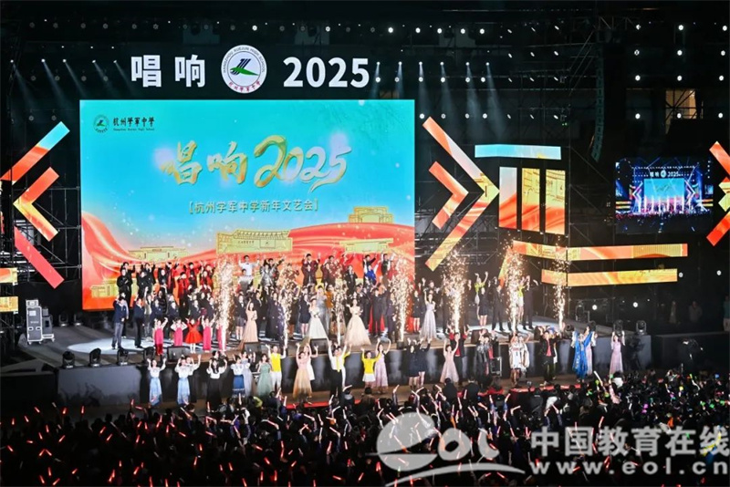 中国教育在线浙江站讯 (记者 陈显婷 通讯员 杨熙铭)1月21日,“唱响2025”杭州学军中学教育集团新年文艺会在奥体中心体育馆火爆开唱,西溪校区、紫金港校区、海创园学校、文渊中学、文渊实验学校、文渊实验小学和桐庐学校等7所学校上万名师生齐聚,全场成了荧光棒的海洋。