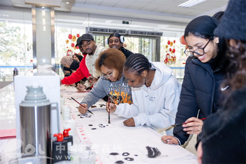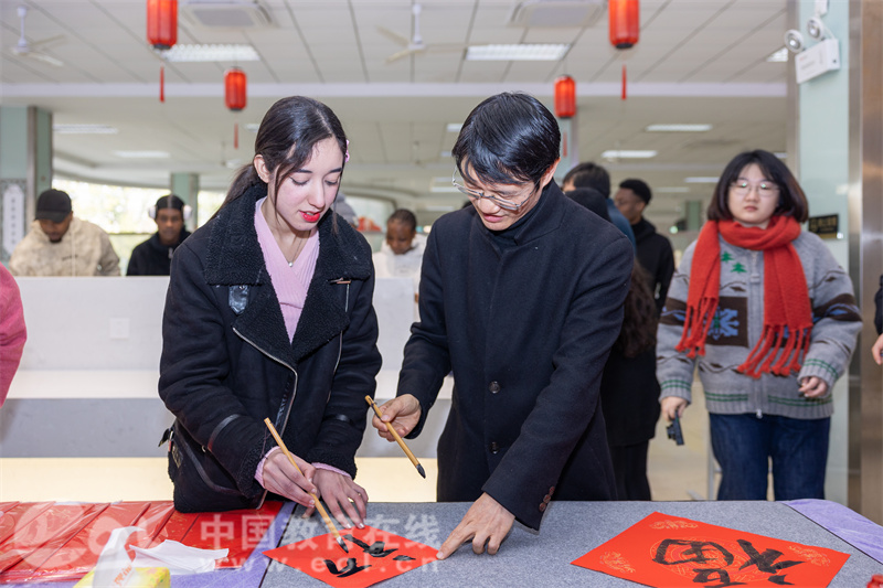 在学校的餐厅中,来自摩洛哥、孟加拉国、乌兹别克斯坦、津巴布韦等10余个国家的30余名留学生,在老师们的带领下,毛笔蘸墨共同写下对新年的美好祝愿。希玛是一名来自摩洛哥的大一学生,今年也是她第一次在中国体验春节传统文化。