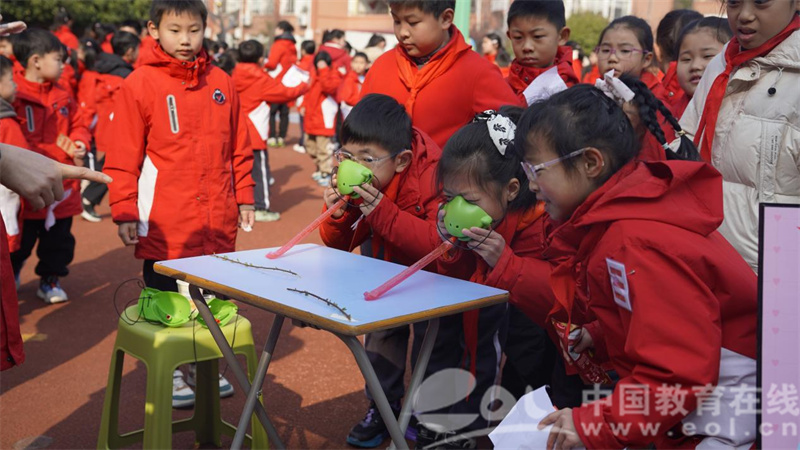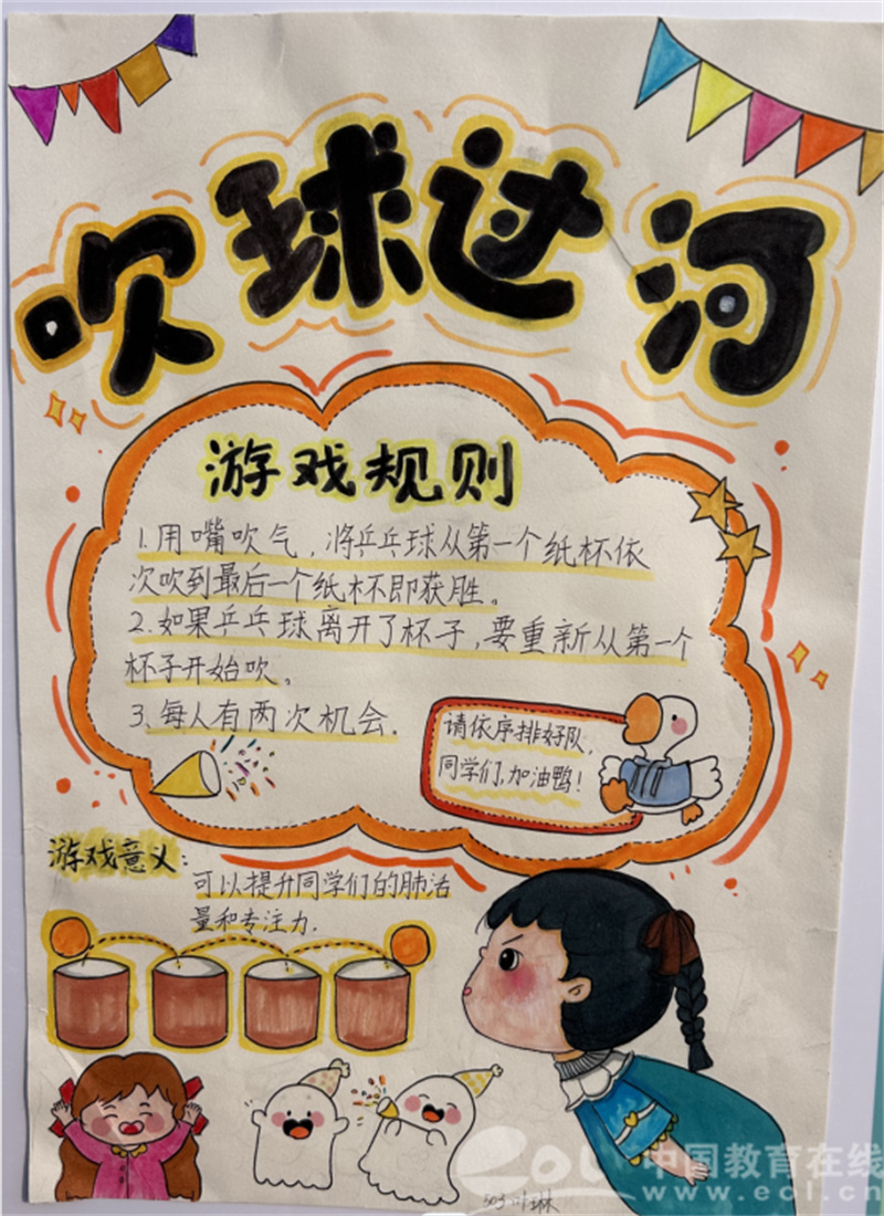 手工游戏充满创意与乐趣。303班“吸福气”,既有满满的美好寓意,又锻炼了学生的肺活量。503班“吹球过河”,同学们用嘴吹气,将乒乓球从一个纸杯吹到另一个纸杯,考验肺活量与技巧。603班“打地鼠”,同学们用彩纸编号,通过数字或颜色指令进行游戏,传承经典玩法。这些游戏让同学们在实践中激发创意,培养动手能力。