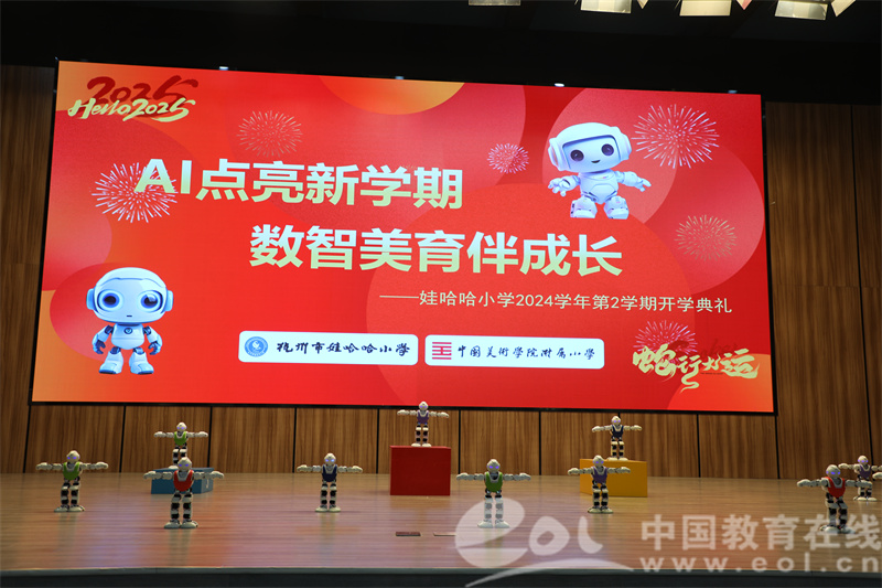 中国教育在线浙江站讯(记者 白菁洁 通讯员 潘妍)杭州市娃哈哈小学开展以“AI点亮新学期 数智美育伴成长”为主题的开学典礼。通过“人机对话”“AI校长面对面”“与机器人共舞”“AI绘画成果展”等环节营造充满未来感的开学仪式,以AI互动传递“学习即创造”的理念,为新学期注入科技驱动力。