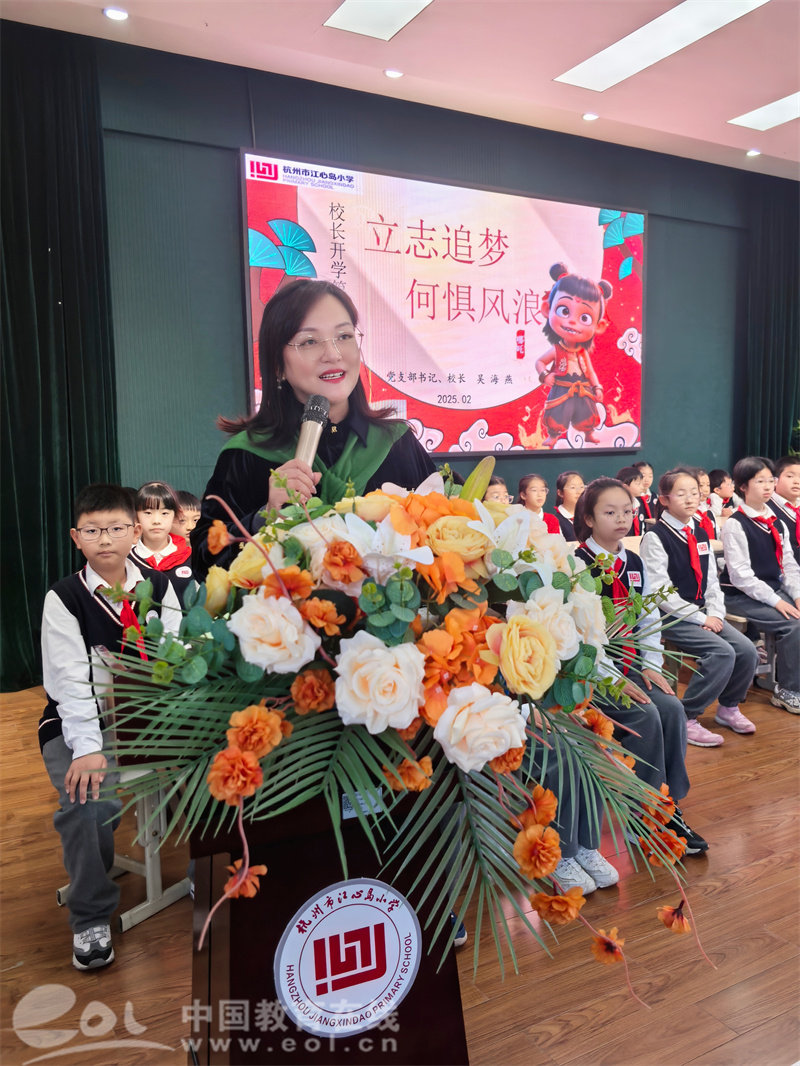 在备受瞩目的校长第一课上,书记、校长吴海燕以《立志追梦 何惧风浪》为主题,为全体师生带来了一场振奋人心的演讲。吴校长鼓励大家在新学期树立远大志向,勇敢追逐梦想,在面对困难和挫折时要不畏风浪,勇往直前。吴校长的话语如同一盏明灯,照亮了同学们前行的道路,激发了大家的奋斗热情。副校长金瑛则以《借哪吒精神,燃开学斗志》为主题,鼓励小朋友们勇敢尝试,敢于和困难抗争,在新学期努力拼搏,创造属于自己的辉煌。