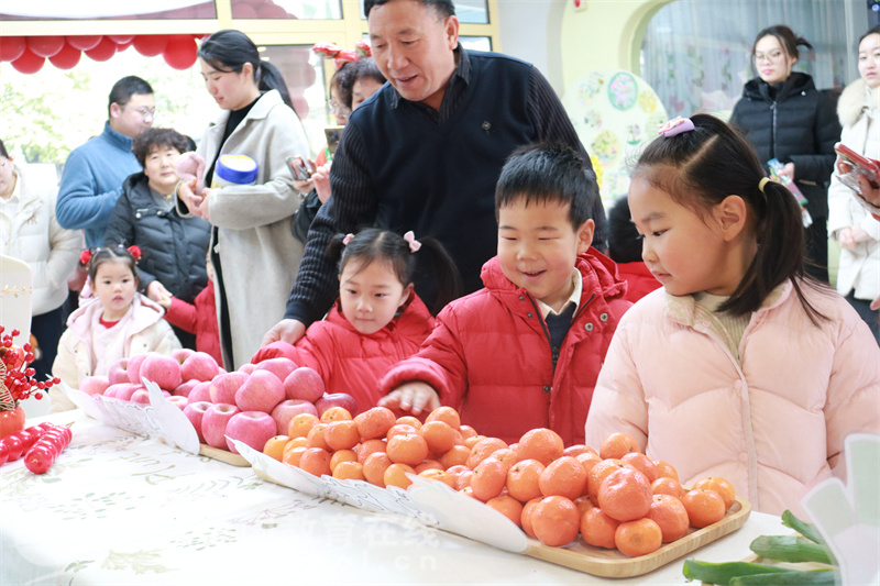 在“摸摸彩头”区域,一张摆满了各种吉祥物品的台面吸引着孩子们的目光。有象征聪明伶俐的葱、寓意大吉大利的砂糖橘、代表平平安安的苹果……孩子们好奇地伸出小手,轻轻触摸着这些物品,嘴里还念念有词,仿佛真的能把这些美好的祝福都装进心里。