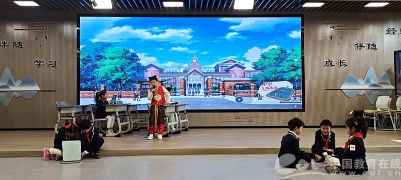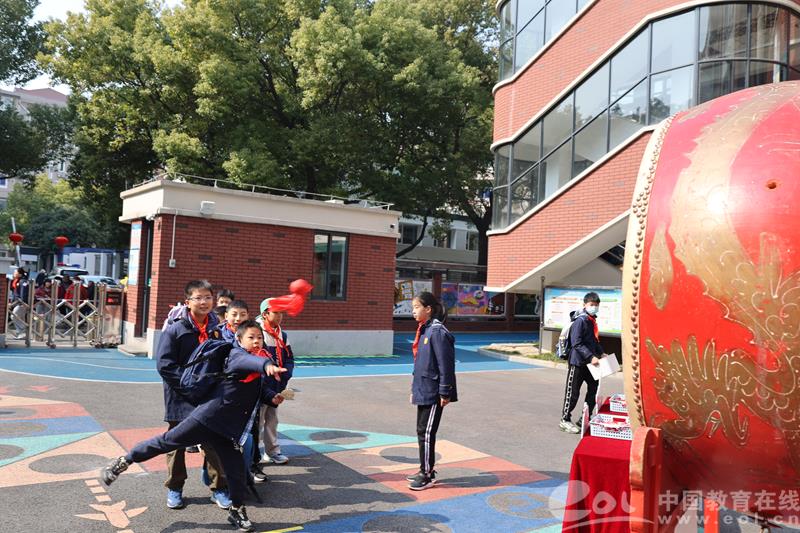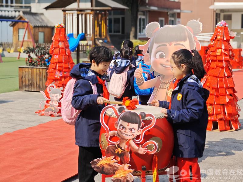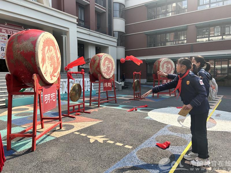 开学首日,校门口出现了哪吒的三大神器——混天绫、乾坤圈、风火轮。这是学校为“青青·蓝蓝”们精心准备的“新学期指引神器”。每个神器下都摆放着一面大鼓,对应着“明志、炼能、厚基”。“青青·蓝蓝”们手持“红莲”,瞄准心仪的鼓,用力投掷。每一个鼓点,都承载着对新学期的期待与憧憬。