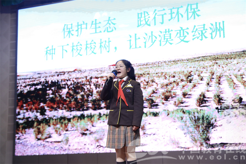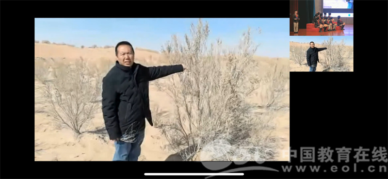 六年级学生马欣瑜曾和家人一起奔赴甘肃民勤,“在沙漠里,我找到了我们的崇文林!它就在民勤抗击沙漠的最前方,崇文林的梭梭树已经长得和我一样高了!”在环保思政课上,马欣瑜和现场的伙伴们讲述了自己的寻林之旅。