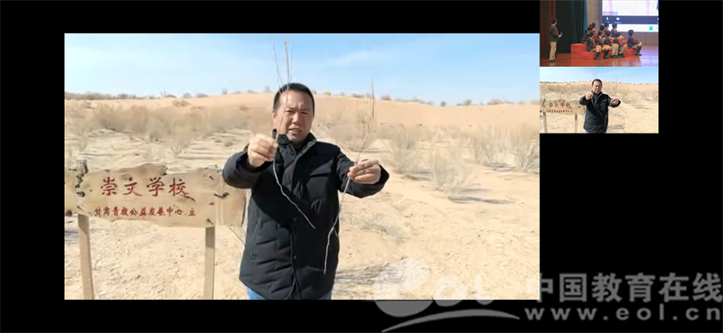“大家现在看到的就是崇文林,同学们,你们知道吗,崇文林已经种植了13500多棵梭梭树了!”通过实时连线,崇文学子与甘肃青梭公益中心负责人马俊河老师云端共植,在相距2500公里的两端扬起沙土,种下象征绿色希望的梭梭树苗。孩子们在屏幕这头屏息凝神,这一刻,他们的生态梦在数字时代同频共振。