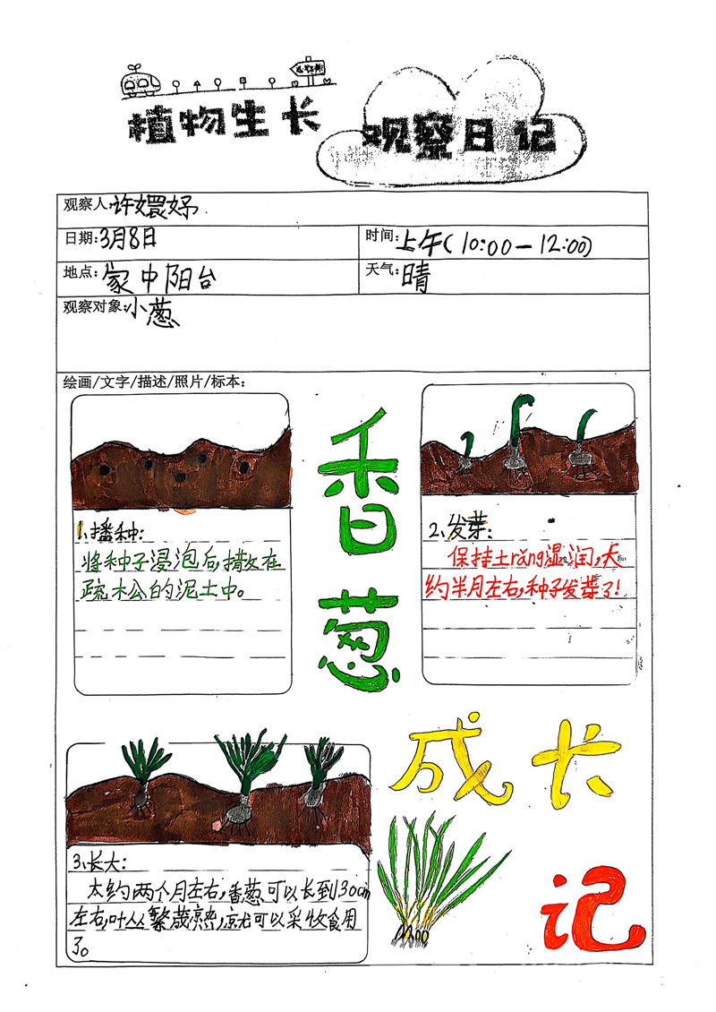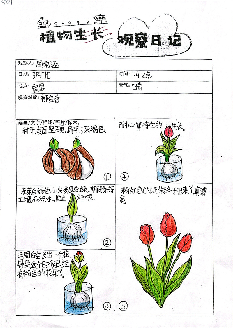 此外,同学们积极参与绿植生长观察日记活动。他们精心养护自己的绿植,仔细记录浇水情况,认真观察植物的每一点生长变化。有的同学用文字详细描述植物的状态,有的则用简单可爱的简笔画描绘出绿植的模样。在这个过程中,同学们不仅学会了照顾植物,更深刻感受到生命的神奇与脆弱,进一步增强了对大自然的敬畏之心。
