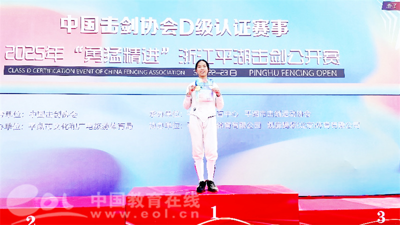中国教育在线浙江站讯 (编辑 陈显婷 通讯员 彭琼霞)近日,中国击剑协会公开赛圆满收官,杭州第十中学704中队的冯乐苇宛如一颗璀璨的新星,凭借着炉火纯青的技艺和坚韧不拔的毅力,一路过关斩将,最终勇摘全国击剑冠军的桂冠,成为赛场上最为耀眼的焦点。