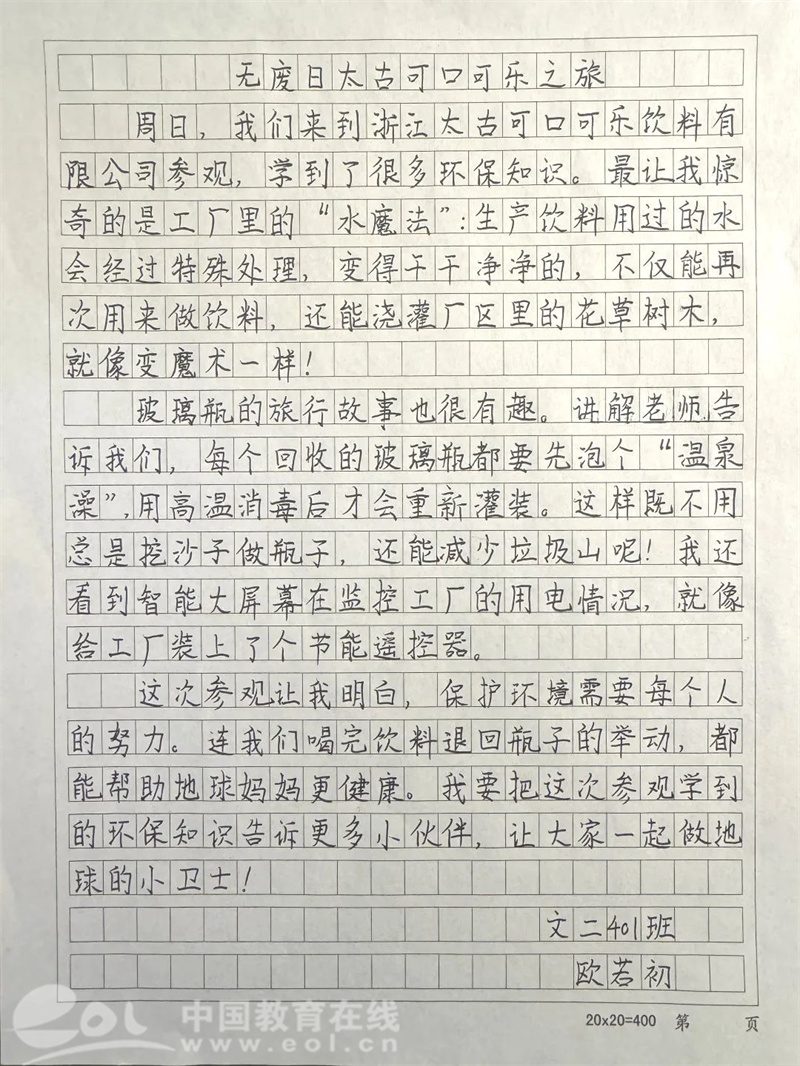 此外,学生们还纷纷写下参观后的感受。有的学生在文章中提到,亲眼看到可口可乐公司的环保举措,才真正理解了“无废”并不遥远,就在生活的点滴之中;还有的学生表示,要从自己做起,带动家人一起参与到 “无废城市”的建设中去。这些真挚的文字,蕴含着孩子们对环保的热情和决心。