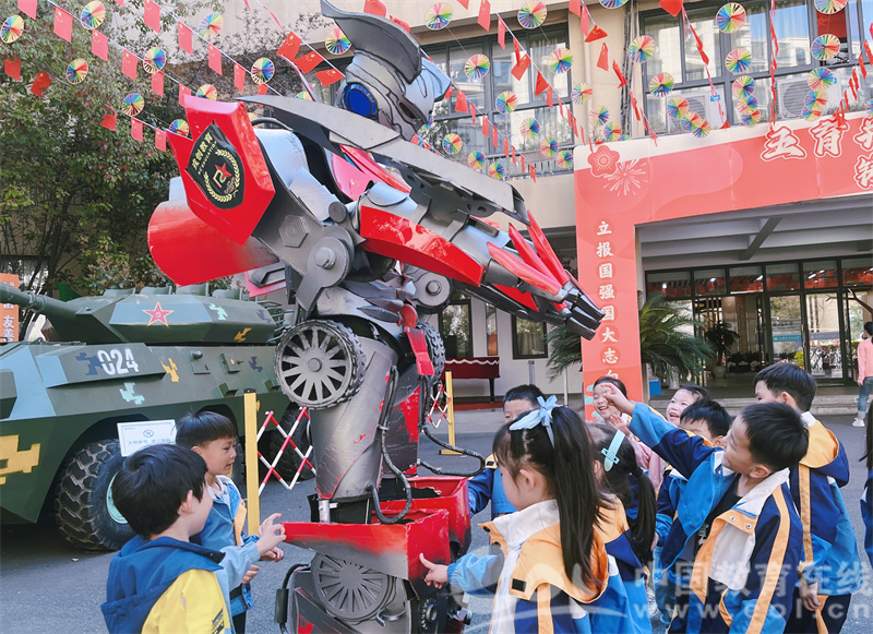 活动当日,孩子们手拉着手踏入小学门口的那一刻,便被高大的机器人和威风凛凛的塔克所吸引,校园展厅中排列整齐的军事装备、坚不可摧的航空母舰模型、灵活敏捷的导弹发射车……每一件模型都像是在诉说着保家卫国的故事。小朋友们仰着小脑袋,眼睛瞪得大大地倾听着教官叔叔的介绍,充满好奇与惊叹,时不时发出“哇”的声音。这次意外的巧遇在孩子们心中悄然埋下了爱国的意识,伴随着时间的推移,将会像种子一样生根发芽、茁壮成长。